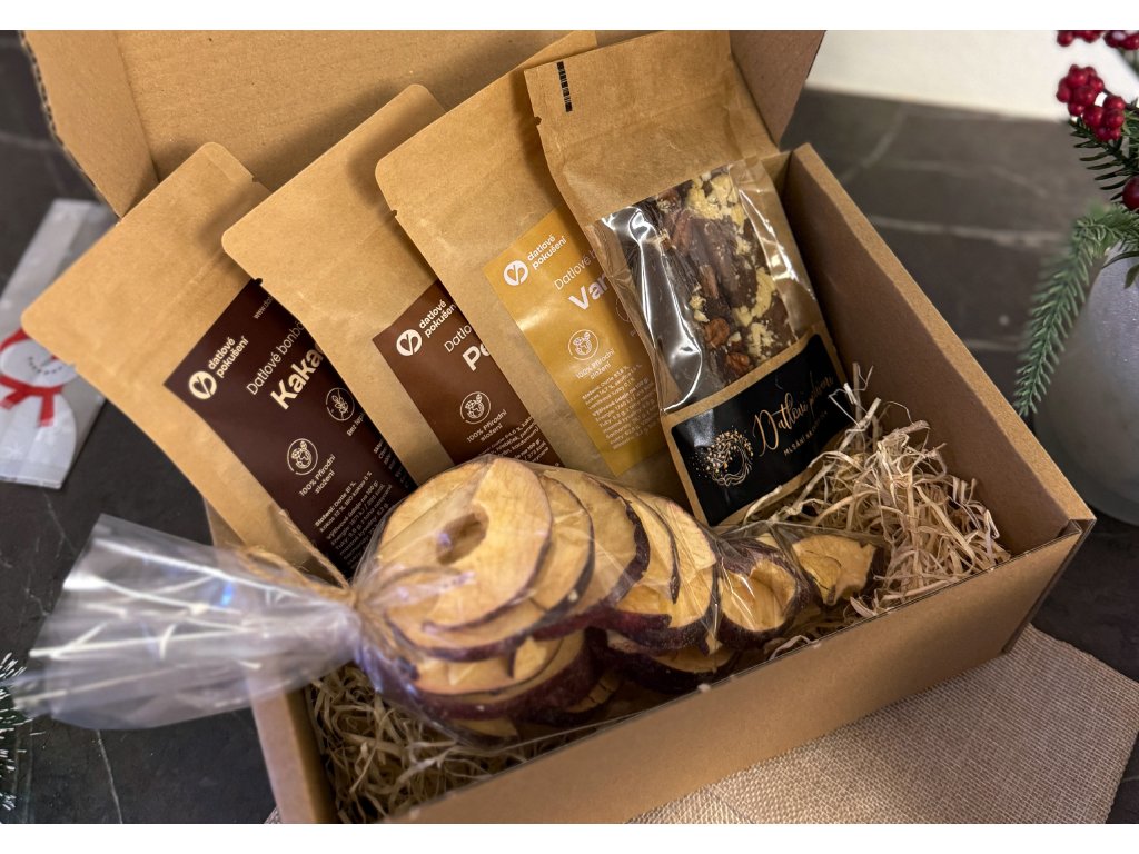 ? Složení: Datlové bonbóny Vanilka, Datlové bonbóny Perník, Datlové bonbóny Kakao, Datlové tyčinky Kešu a pekany, Lyofilizovaná Jablka