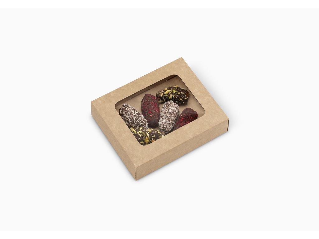 | Balení: | Balení obsahuje 2x Datle v tmavé čokoládě s nepraženými pistáciemi, 2× Datle v tmavé čokoládě s lyofilizovanými malinami, 2× Datle v tmavé čokoládě s kokosem |