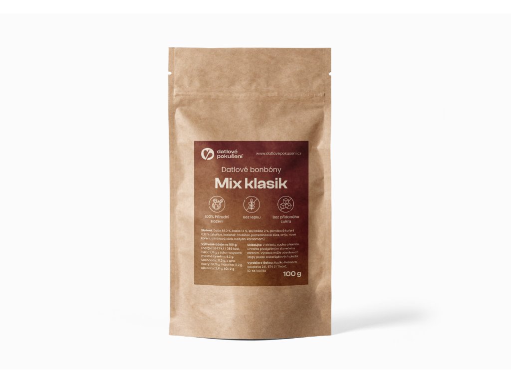 Balení: | 100 g balení obsahuje zhruba 20-25 bonbónů balených ve znovuuzavíratelném zip sáčku. |