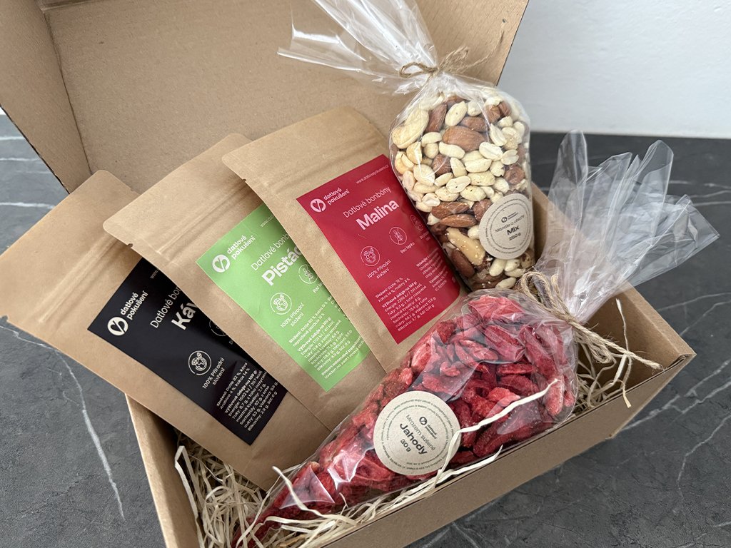 Je Valentýn. Svíčky tiše plápolají, ve vzduchu je cítit očekávání a mezi dvěma lidmi se odehrávají ta nejhezčí gesta – drobná, ale upřímná. Když otevřete tenhle dárkový box, objevíte kombinaci ovocné svěžesti, jemné sladkosti a poctivých ořechů. Každé sousto je malým vyznáním: bez zbytečností, bez přidaného cukru, jen čistá chuť.